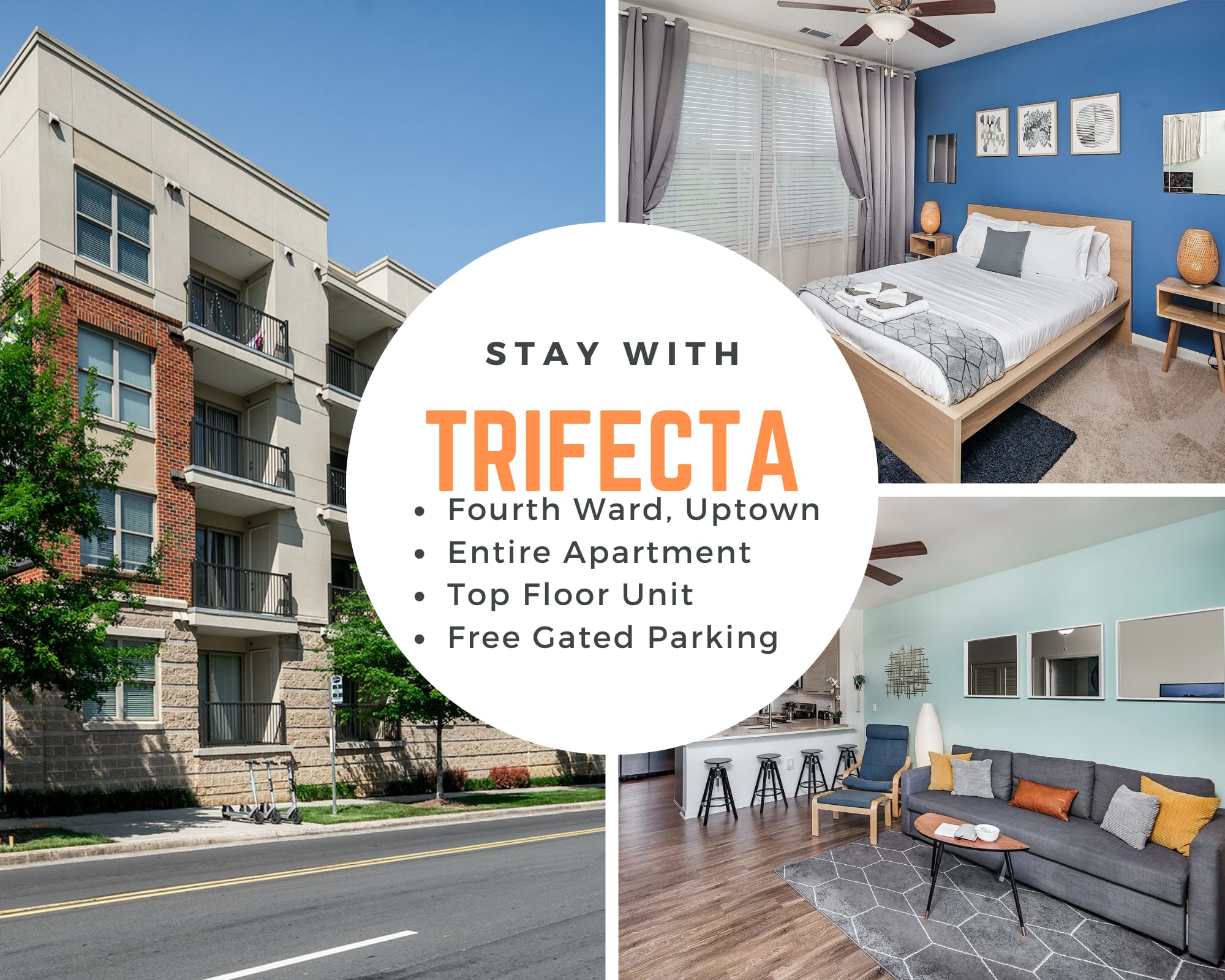 The Trifecta is a luxury serviced apartment in the Uptown District of Charlotte that includes a fully stocked kitchen, comfortably furnished rooms, and free enclosed private parking.