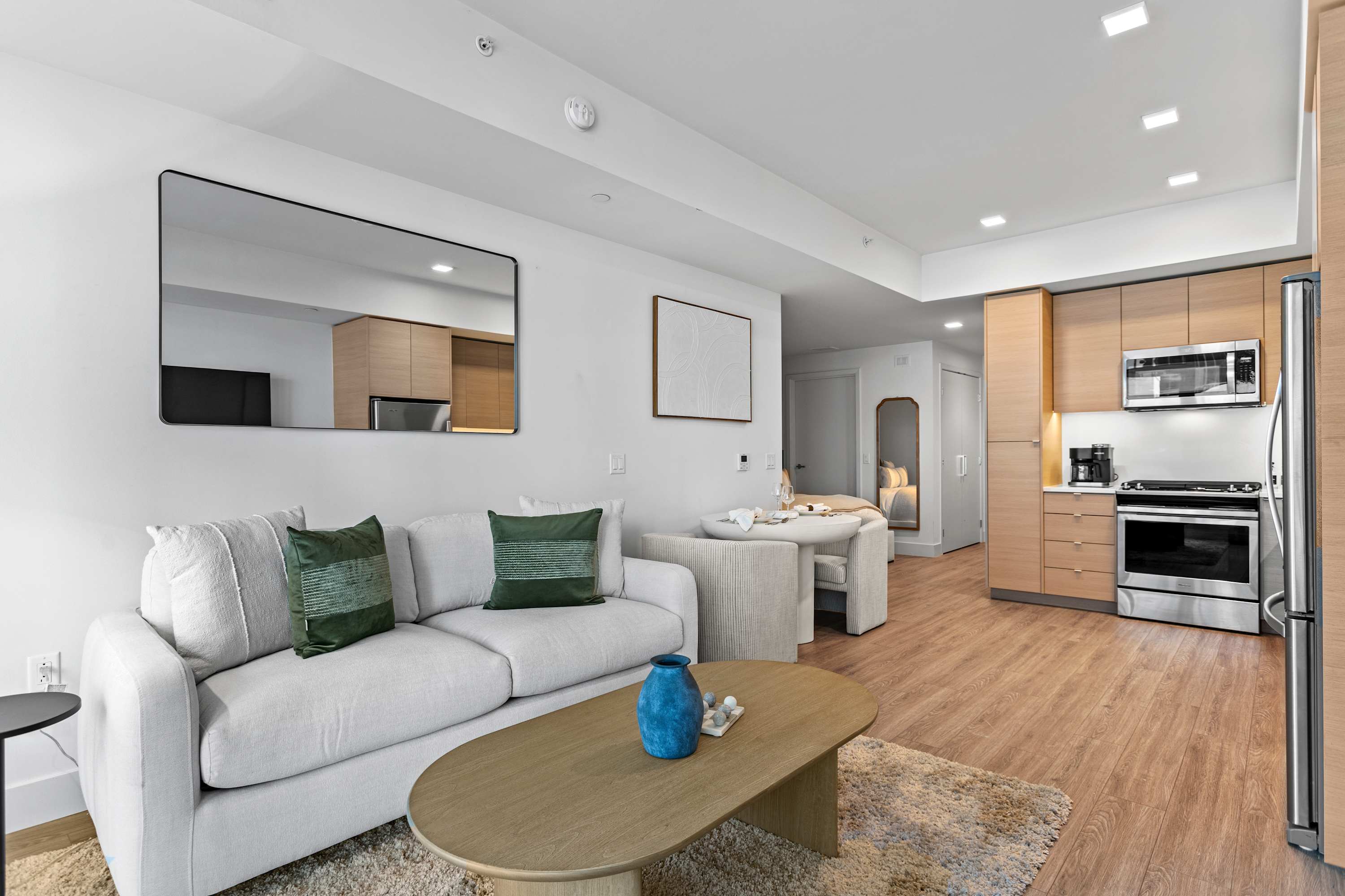 Relax on the cozy sofa and enjoy your favorite shows on the Smart TV with Netflix. The open layout makes this studio feel spacious and inviting.